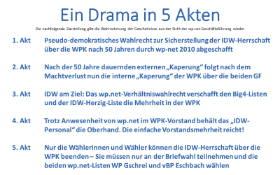 Vier Wochen nach der Wahl sehen wir dunkle Wolken über der WP-Kammer … Liebe Leserin, lieber Leser, zweimal haben sich die Vertreter der wp.net-Listen mit dem Fünferblock aus IDW/Big4-Listen "online" getroffen. Wie es uns scheint, haben die 5 IDW/Big4-Listen keine...